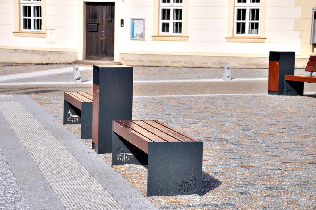 Instalovaný mobiliář: lavičky BRUTA, lavičky BRUTO, odpadkové koše RAILA, stojany na kola RUBIG, vitríny CLM, žulové patníky s nerez krytkou pro vestavěné svítidlo, stromové mříže litinové.