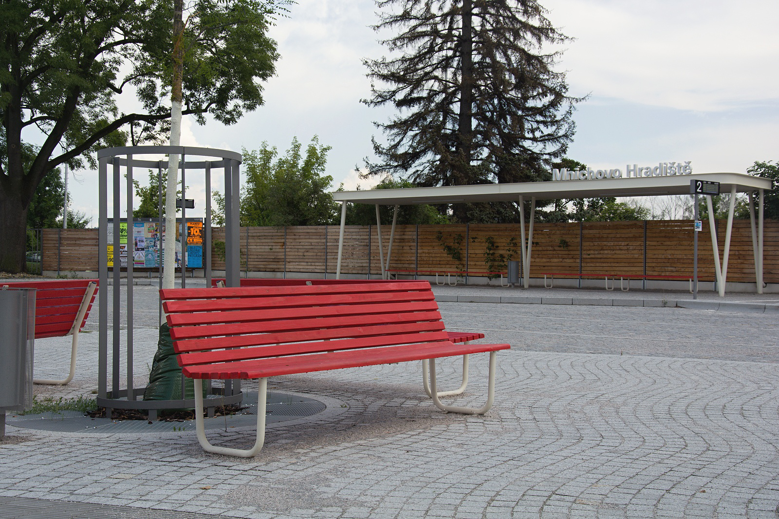 Instalovaný mobiliář: atypické parkové lavičky s opěrkou zad a bez, atypické stojany na kola, parkovací zábrany, odpadkové koše BAS M, informační nosiče UNITAB a K.D.K., atypický sloupek