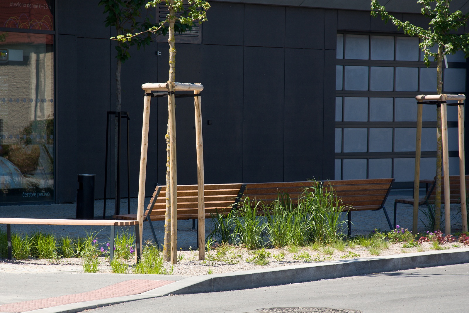 Instalovaný mobiliář: parkové lavičky INOA, odpadkové koše MAG