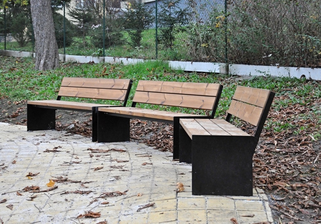 Instalovaný mobiliář: lavičky EKTA, nerezové bidýlko.