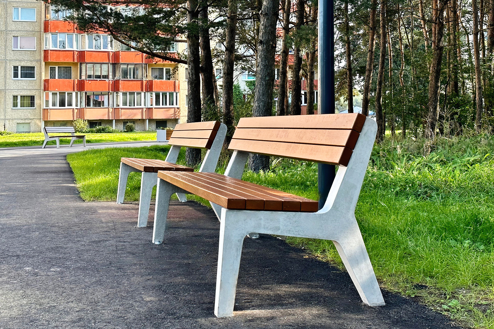 Instalovaný mobiliář: lavičky BETLA, nádoby na zeleň PETA.