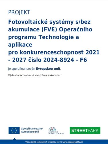 Projekt Fotovoltaické systémy s/bez akumulace (FVE) je realizován v rámci Operačního programu Technologie a aplikace pro konkurenceschopnost 2021–2027, číslo 2024-8924 – F6. Projekt je spolufinancován Evropskou unií a jeho cílem je výstavba fotovoltaické elektrárny s akumulací za účelem zvýšení energetické soběstačnosti a snížení provozních nákladů společnosti.