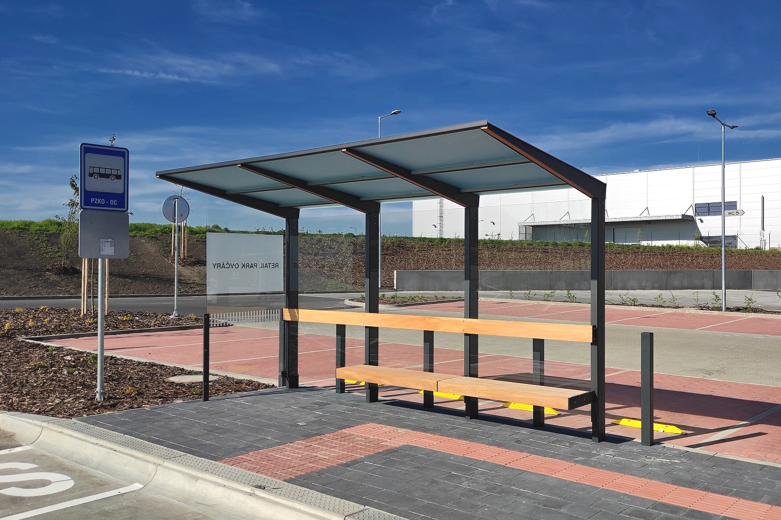 Zinkovaná ocelová nosná konstrukce je opatřena práškovým vypalovacím lakem. Výplně stěn jsou z bezpečnostního kaleného skla či palubek z masivního dřeva, případně jejich kombinace. Pro zasklení střechy je použito bezpečnostní tvrzené sklo buď v čirém provedení nebo v provedení Satinato nebo vícekomůrkový polykarbonát. Ke spodní nosné konstrukci jsou uchyceny pomocí hliníkových profilů. Lavička je tvořena z latí z masivního dřeva připevněných nerezovými vruty k nosné konzolové konstrukci. Ve spodní části stojin jsou platle pro skryté kotvení k podkladu pod úrovní terénu.