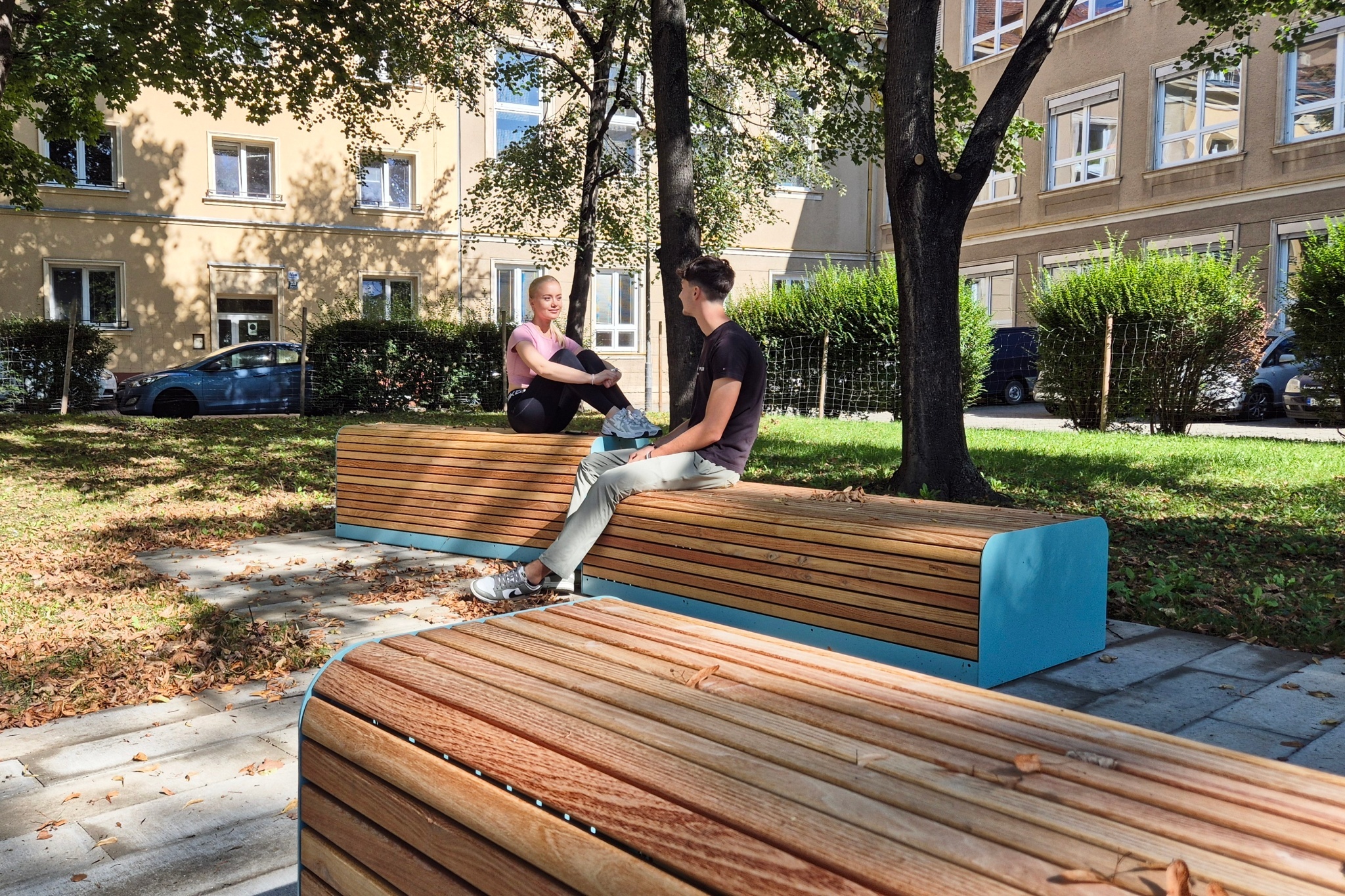 The park in front of the grammar school on Vídeňská Street in Brno has undergone a pleasant transformation. During the summer, new trees were planted, and new benches and relaxation areas were added. The revitalization has brought more greenery and space for gatherings, both for the students of the grammar school and for residents.