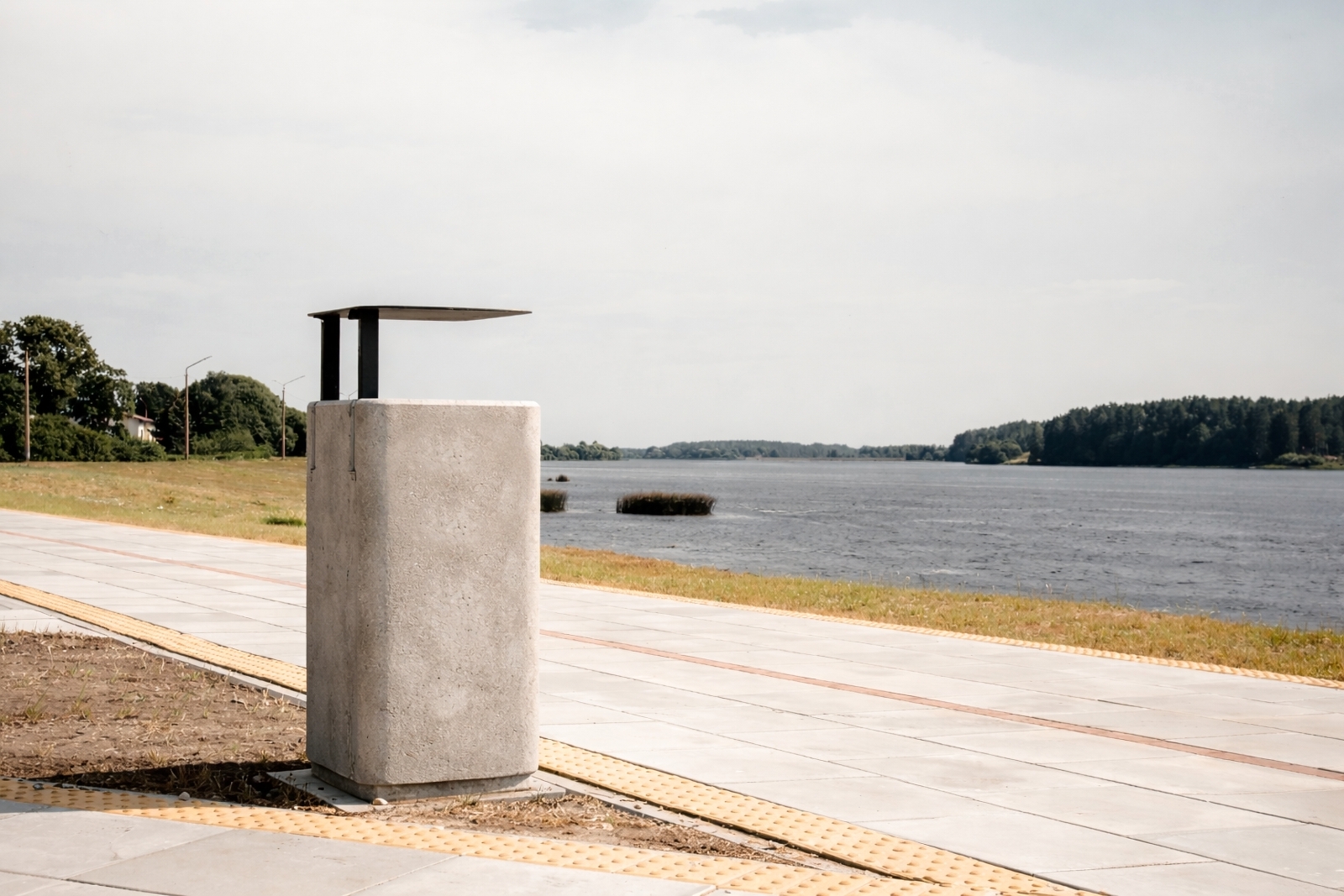 Concrete cast in the mold – class C35/45. The metal parts of the litter bin are galvanized and treated with powder coating. The inner removable galvanized container. The litter bin is not anchored. It uses its own weight.