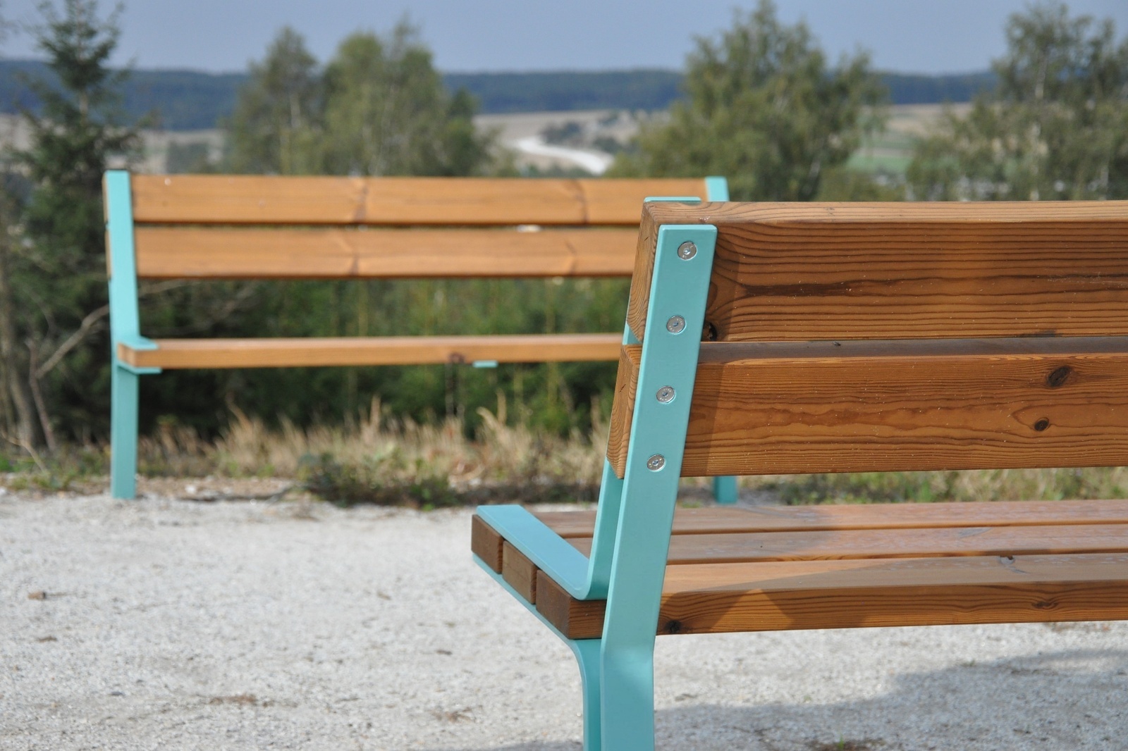 The galvanised steel structure is treated with powder coating. The seat and backrest consist of solid wood boards clamped between metal parts and secured with stainless steel screws. The legs are finished below ground with plates for anchoring to the base.