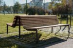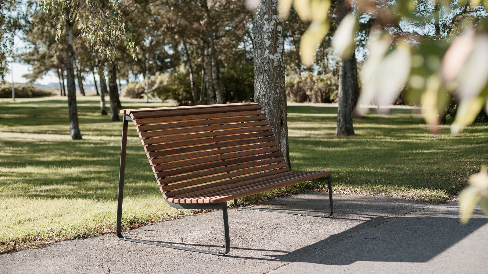 The supporting structure is made of galvanized steel and is treated with powder coating. A seat and backrest are made from solid wooden lamellas that are attached to the supporting structure with stainless screws. At the bottom part of the bench, there are four holes for anchoring to the base.
