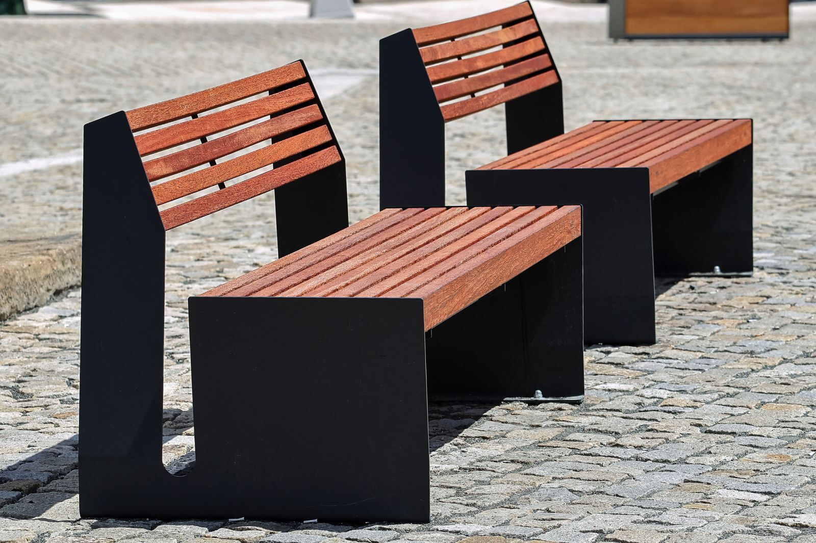 Instalirna urbana oprema: parkovne klopi VEGA, parkovne klopi RADIANO, koši za odpadke MAG, korita za rastline PETA a CIMI, stojala za kolesa VELONE